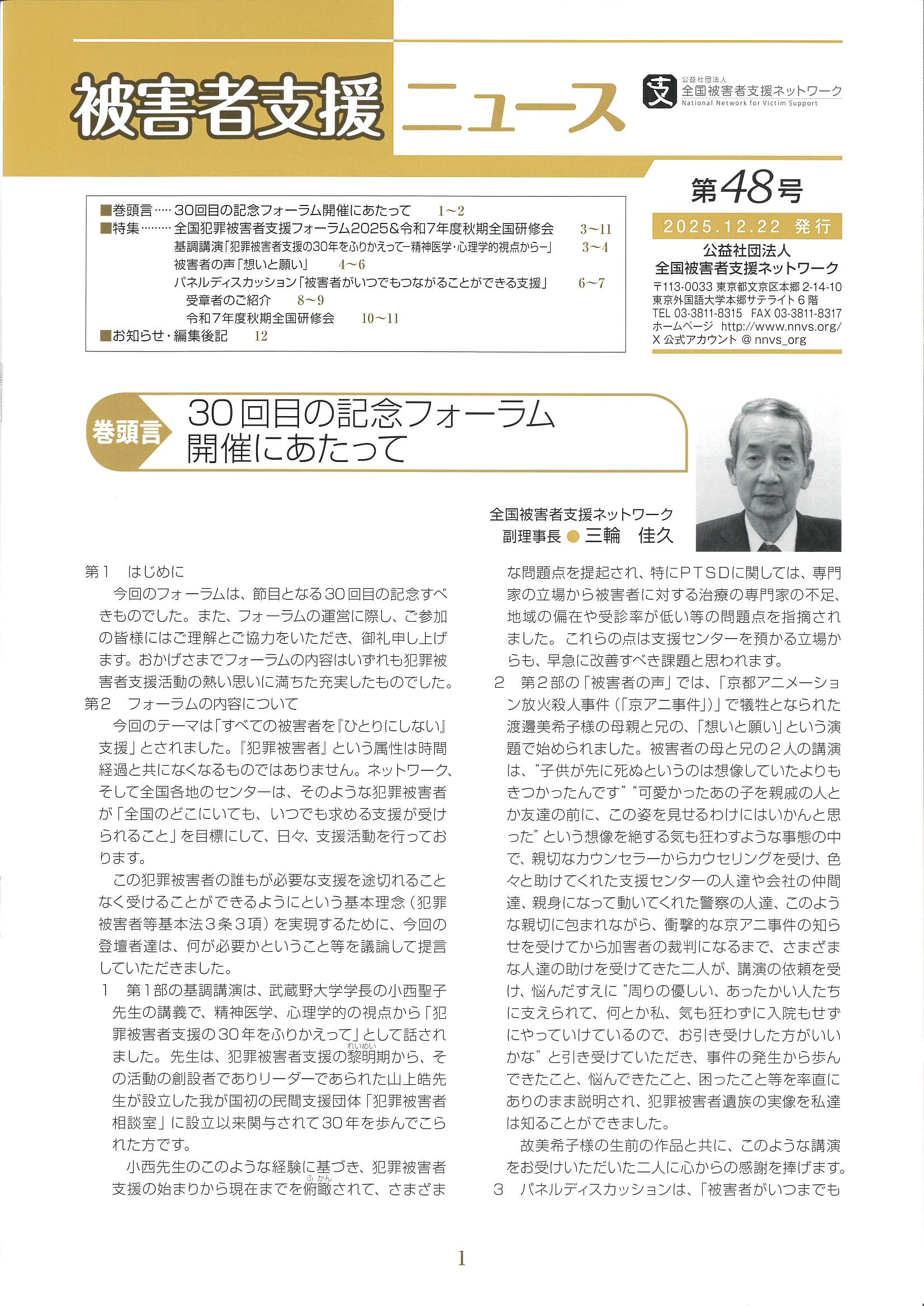 12/22に被害者支援ニュース第48号を発行しました。 今号は、10月に開催した全国犯罪被害者支援フォーラム&秋期全国研修会を特集しておりま ...