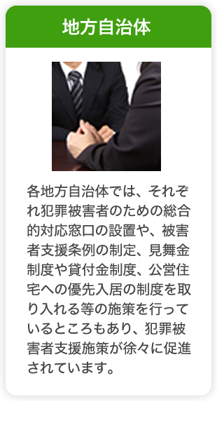 各地方自治体では、犯罪被害者のための総合的対応窓口の設置や犯罪被害者等に対する見舞金等の支給制度、生活資金等の貸付制度の導入、また公営住宅の優先入居等、居住場所の確保や被害直後からの生活支援に対する取組がなされています。